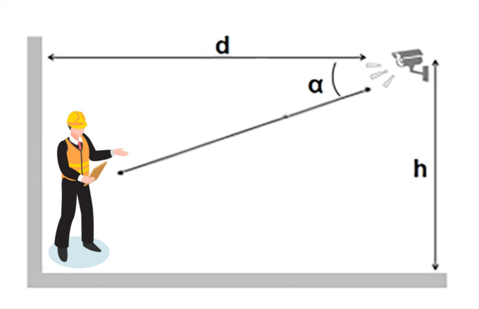 The camera should be positioned at a height (h) of 1.3–2.0 meters above ground with a downward tilt angle (α) of 10°–20°.